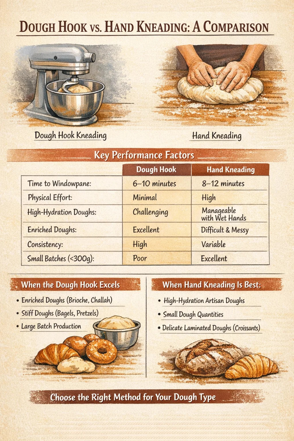 একটি ময়দার হুক হল একটি নির্ভরযোগ্য, বেশিরভাগ রুটি বেকিং পরিস্থিতিতে হাত বুলানোর জন্য ব্যবহারিক প্রতিস্থাপন। মান রুটি doughs জন্য 60% থেকে 72% হাইড্রেশন পরিসীমা , সমৃদ্ধ ময়দা, শক্ত ময়দা, এবং বড়-ব্যাচ উত্পাদন, এটি অনেক কম শারীরিক পরিশ্রমের সাথে সমতুল্য বা উচ্চতর ফলাফল প্রদান করে। মূল বিষয় হল সঠিক গতি ব্যবহার করা, ময়দার তাপমাত্রা নিরীক্ষণ করা এবং শুধুমাত্র সময়ের উপর নির্ভর না করে উইন্ডোপ্যান পরীক্ষার মাধ্যমে উন্নয়ন যাচাই করা।