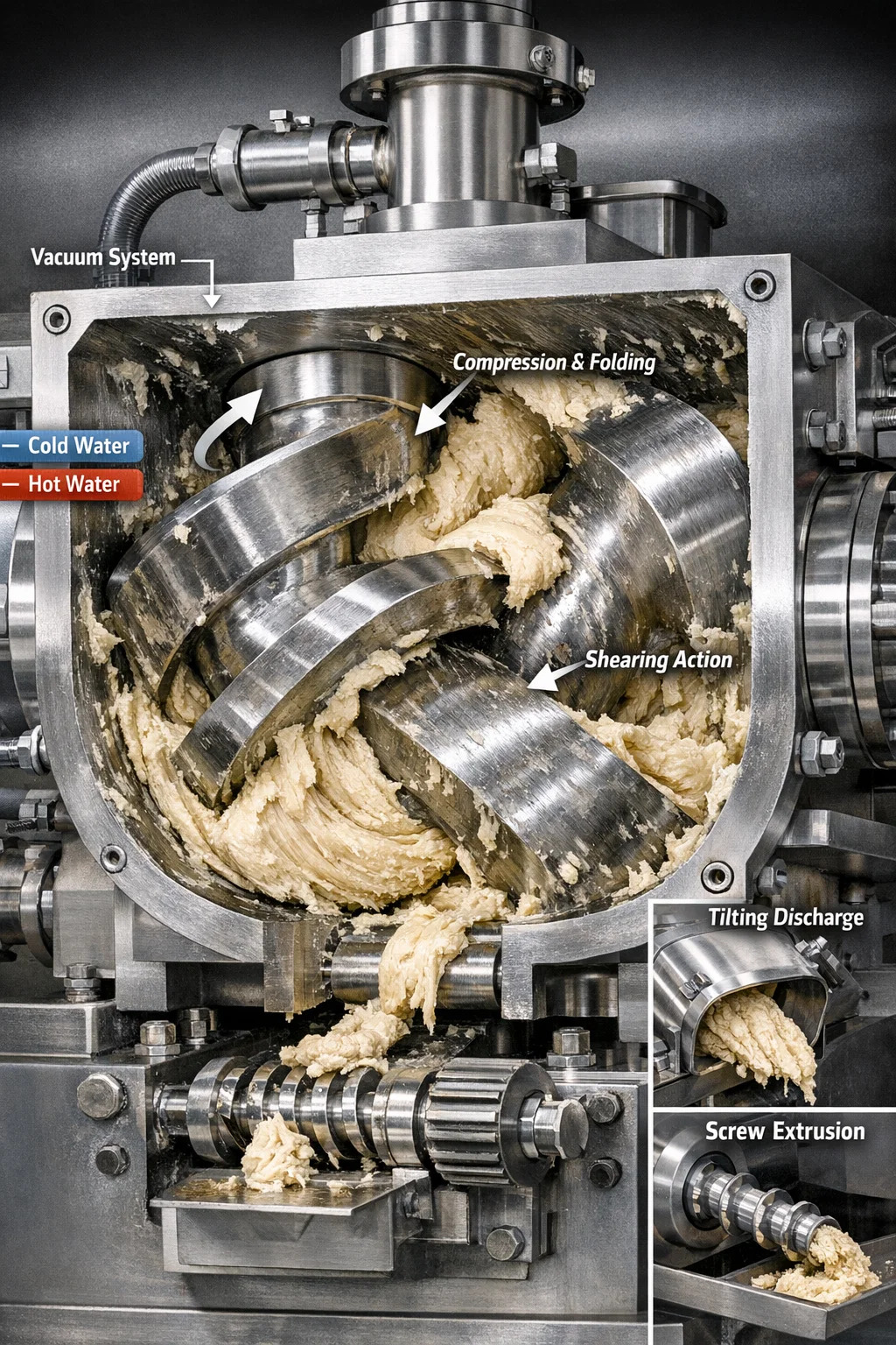 ক kneader বাড়িতে ময়দা মাখার মতো একই নীতিতে কাজ করে, তবে এটি প্রচুর যান্ত্রিক শক্তি এবং অত্যাধুনিক ধাতব কাঠামো ব্যবহার করে। এটি কেবল সহজ "নাড়া" নয়, বরং অত্যন্ত সান্দ্র উপাদানগুলিকে প্রক্রিয়া করে যা সাধারণ চামচ বারবার "গুঁড়া, চেপে, টানতে এবং ছিঁড়ে" দিয়ে পরিচালনা করতে পারে না।