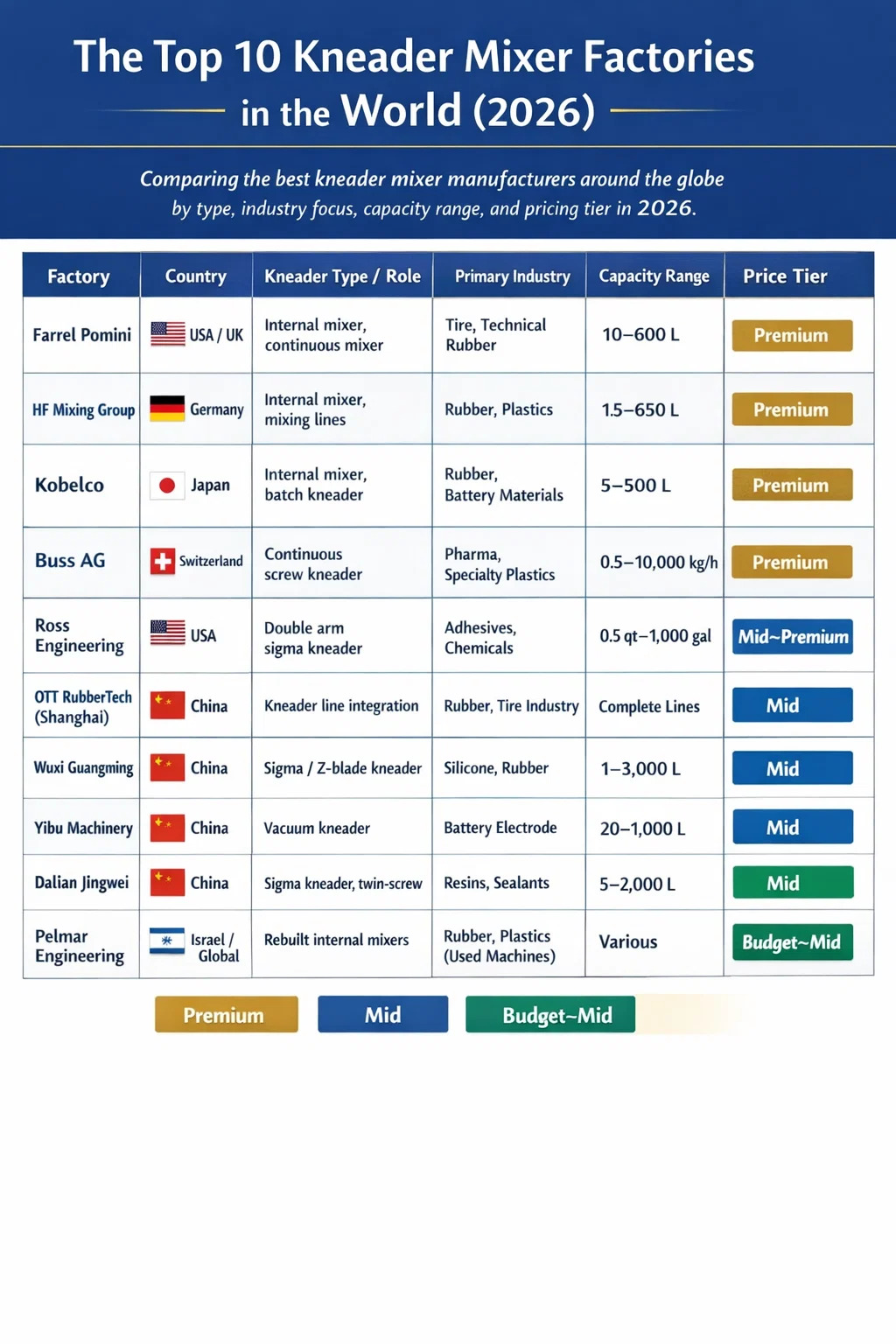আপনি যদি একটি সোর্সিং হয় kneader রাবার, সিলিকন, আঠালো, ব্যাটারি সামগ্রী, বা উচ্চ-সান্দ্রতা যৌগগুলির জন্য মিক্সার, আপনি যে প্রস্তুতকারকের চয়ন করেন তা সরাসরি সরঞ্জামের জীবনকাল, মিশ্রণের গুণমান এবং মালিকানার মোট খরচ নির্ধারণ করবে। প্রোডাকশন স্কেল, টেকনিক্যাল সার্টিফিকেশন, গ্লোবাল ইন্সটলেশন বেস এবং কয়েক ডজন সরবরাহকারীর গ্রাহক প্রতিক্রিয়া মূল্যায়ন করার পর, 2026 সালে যে দশটি কারখানা ক্রমাগতভাবে kneader মিক্সার উত্পাদন এবং সরবরাহে বিশ্বকে নেতৃত্ব দেয় তা হল: ফারেল পোমিনি (USA/UK), HF মিক্সিং গ্রুপ (জার্মানি), কোবেলকো (জাপান), বাস এজি (সুইজারল্যান্ড), রস ইঞ্জিনিয়ারিং (USA), OTT RubberTech International Trading (WChang) লিমিটেড। মেশিনারি (চীন), ইবু মেশিনারি (চীন), ডালিয়ান জিংওয়েই কেমিক্যাল মেশিনারি (চীন), এবং পেলমার ইঞ্জিনিয়ারিং (ইসরায়েল)। প্রতিটিই একটি স্বতন্ত্র শক্তি নিয়ে আসে — সেটা অতি-উচ্চ টর্ক ক্ষমতা, ফার্মাসিউটিক্যাল-গ্রেড স্যানিটারি ডিজাইন, সম্পূর্ণ রাবার ন্যেডিং লাইন ইন্টিগ্রেশন, অথবা মধ্য-আয়তনের উৎপাদনের জন্য খরচ-প্রতিযোগীতামূলক মূল্য।