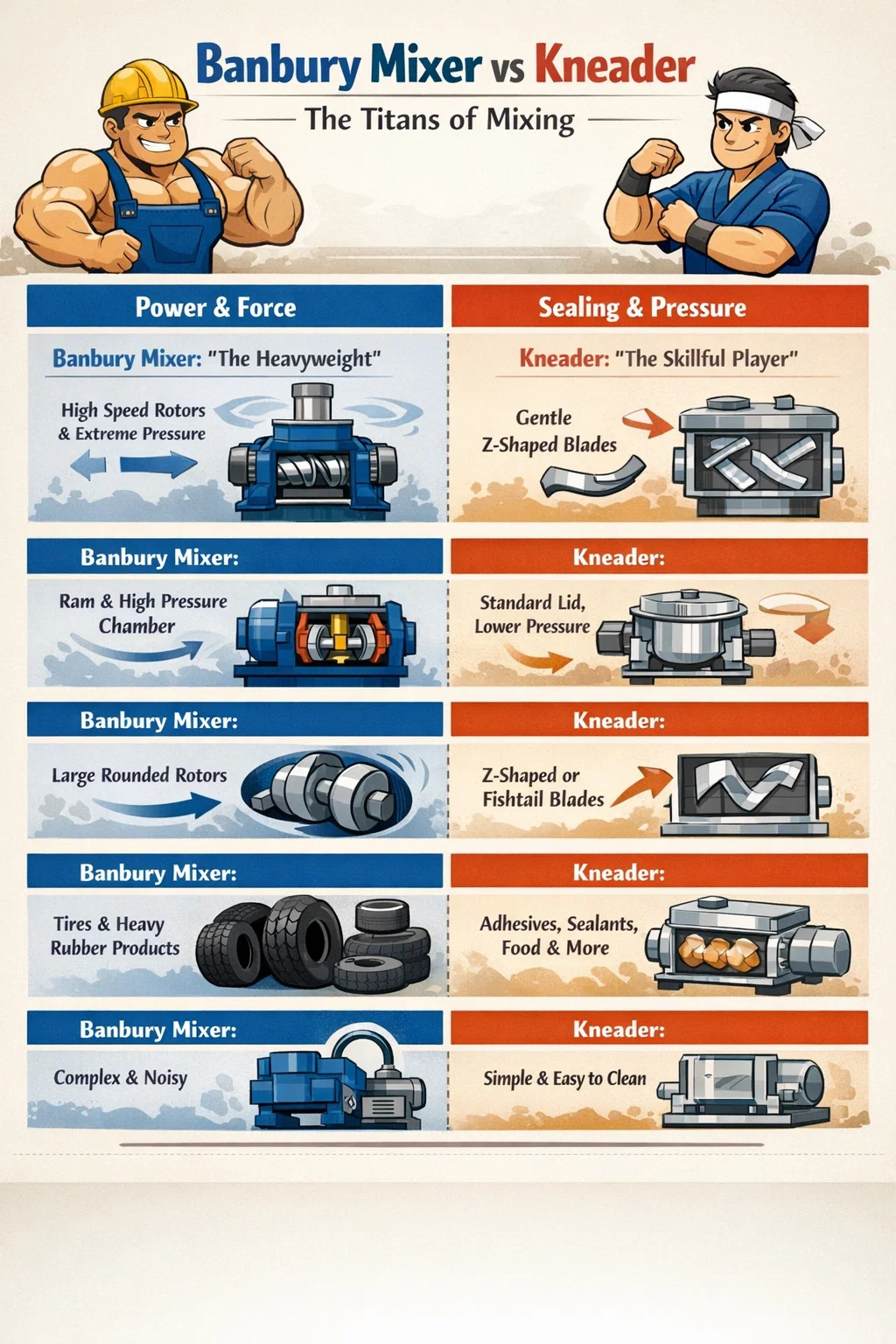 ব্যানবেরি মিক্সার: এটি একটি সাধারণ "হেভিওয়েট"। এর গঠন আরো মজবুত, এবং ঘূর্ণন বল অবিশ্বাস্যভাবে শক্তিশালী। এটি প্রাথমিকভাবে একটি সিল করা চেম্বারে উচ্চ গতিতে ঘূর্ণায়মান দুটি বিশাল রোটারের উপর নির্ভর করে, অত্যন্ত চাপ এবং ঘর্ষণ ব্যবহার করে পুঙ্খানুপুঙ্খভাবে ভেঙে যায় এবং অল্প সময়ের মধ্যে শক্ত রাবার বা প্লাস্টিক মিশ্রিত করে।